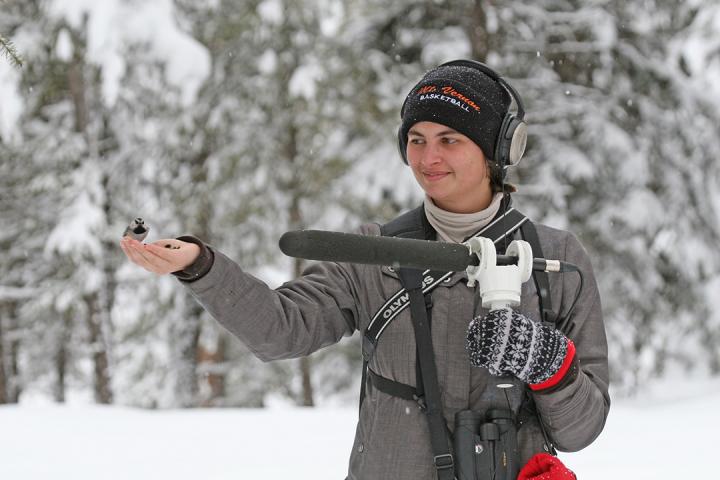 image: Nora Carlson records a chickadee. She arrived at the University of Montana with an undergraduate degree in linguistics and the desire to translate bioacoustics. The nuthatch paper sprang from her UM senior thesis.