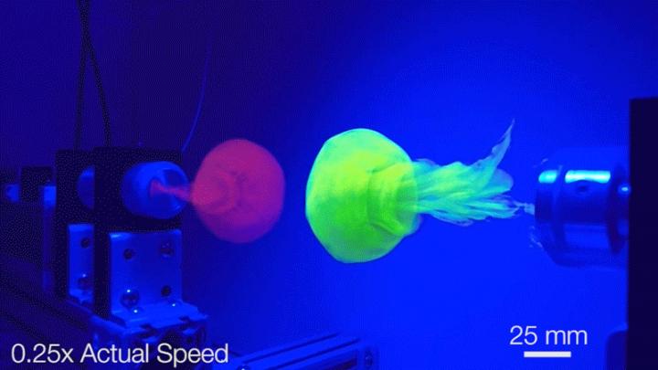 image: Vortex cannons fire in a 75-gallon aquarium to produce the vortices. Each vortex was dyed a different color, so researchers could observe how they interact.