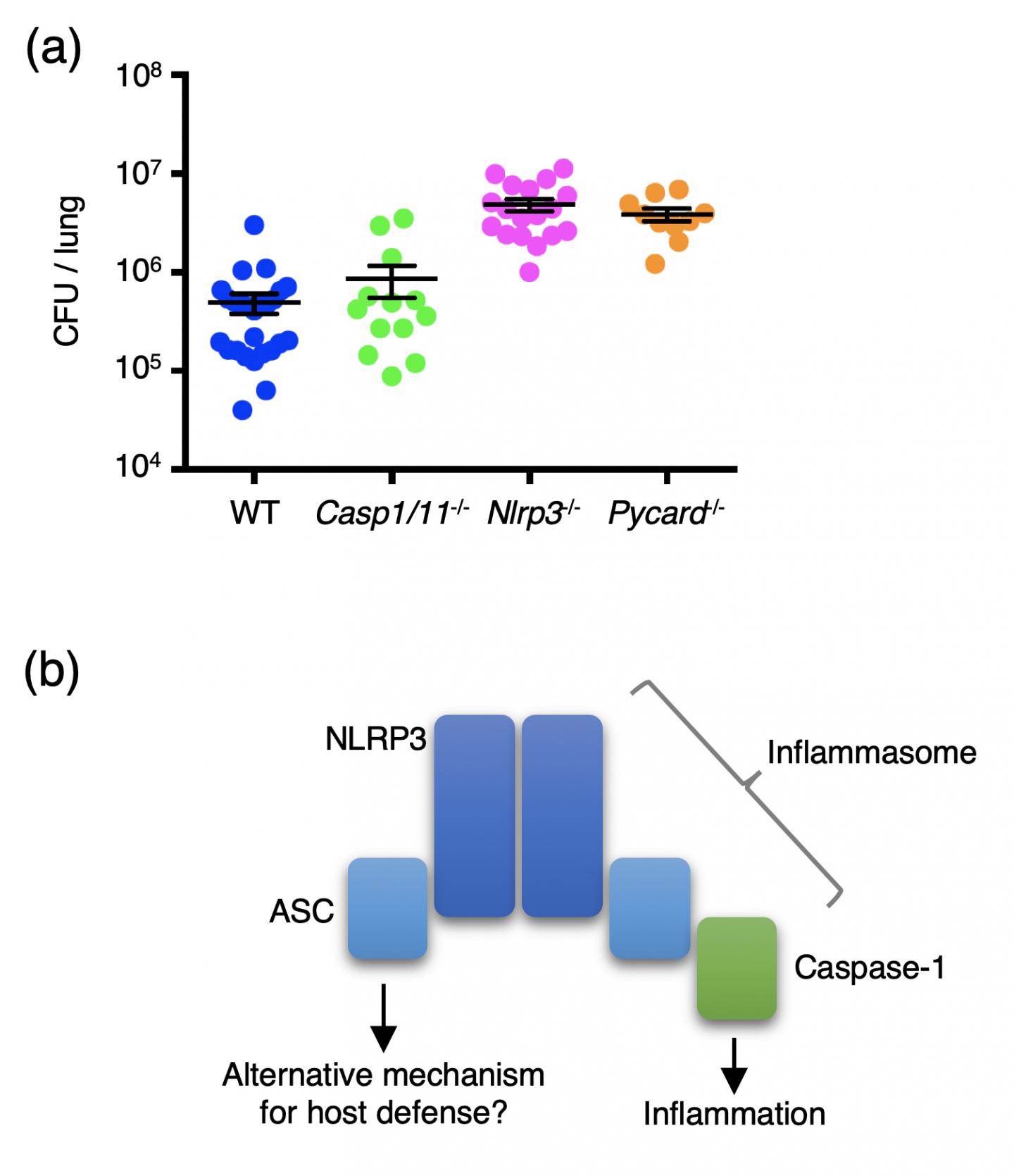 (b) NLRP3 and ASC form the NLRP3 inflammasome in response to distinct stimuli, including S. pneumoniae. The inflammasome recruits and activates caspase-1, thereby promoting inflammation. However, NLRP3 and ASC seem to protect against pneumococcal pneumonia in a caspase-1-independent manner, suggesting an alternative mechanism for host defense that involves NLRP3 and ASC.