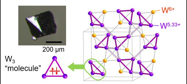 The so-called tritungsten molecules were discovered in single crystals of caesium tungsten oxide (CsW2O6) cooled below -58°C. CsW2O6 conducts electricity at room temperature but changes into an insulating material when it is cooled below -58°C. It has been a challenge to study how the atomic structure of this type of material changes in response to temperature. To overcome this, Okamoto and his colleagues in Japan synthesized very pure single crystals of CsW2O6 and bombarded them with X-ray beams at room temperature and -58°C.
