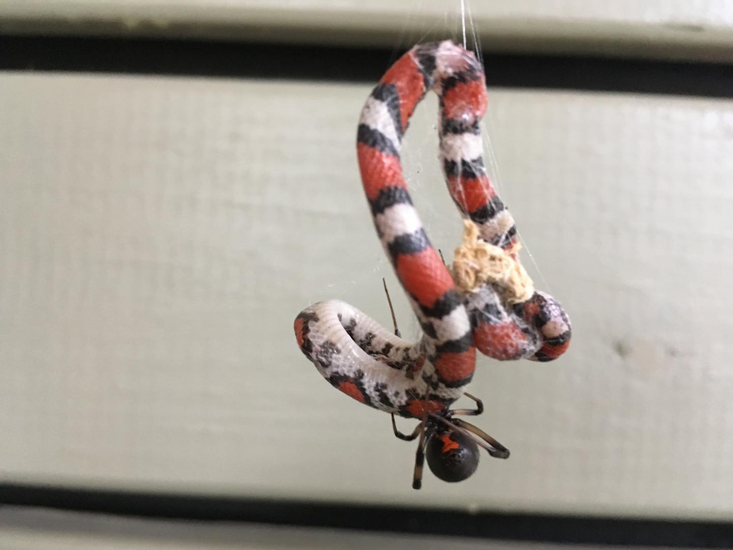 image: Juvenile scarlet snake (Cemophora coccinea, Colubridae) entrapped on web of Latrodectus geometricus, observed in