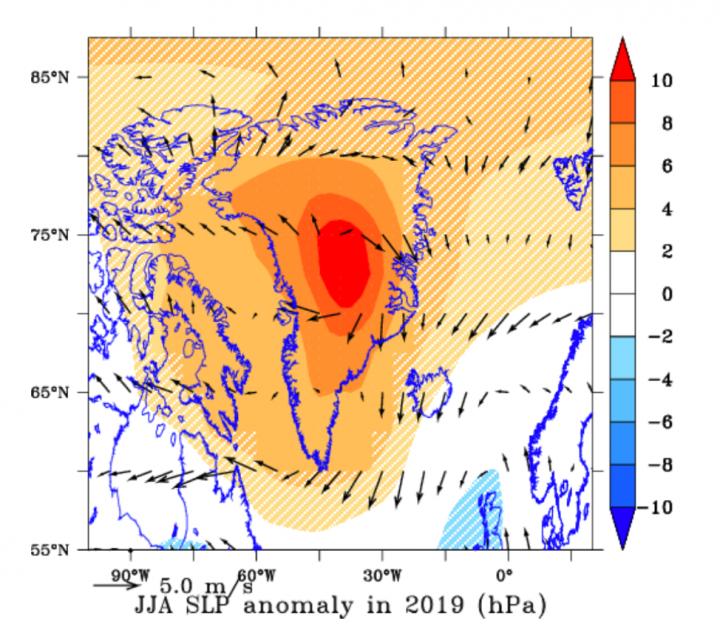 Tedesco and co-author Xavier Fettweis, from the University of Liège, found that the record-setting ice loss was linked to high-pressure conditions (called anticyclonic conditions) that prevailed over Greenland for unusually long periods of time in 2019.
