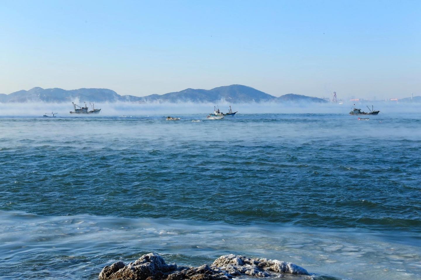 image: Fishing boats amidst "Arctic sea smoke" near Qingdao, China on January 7th. Arctic sea smoke is a result of frigid air passing over relatively warm water; the phenomenon is rare, even in the Arctic.