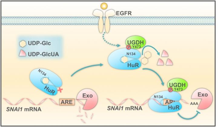 Phosphorylated UGDH binds to HuR and converts UDP-glucose into UDP-glucuronic acid, which attenuates UDP-glucose-mediated inhibition on HuR association with SNAI1 mRNA, thereby enhancing SNAI1 mRNA stability. Increased Snail (encoded by SNAI1) expression in turn initiates the epithelial-mesenchymal transition of tumor cells, thus promoting tumor cell migration and lung cancer metastasis.