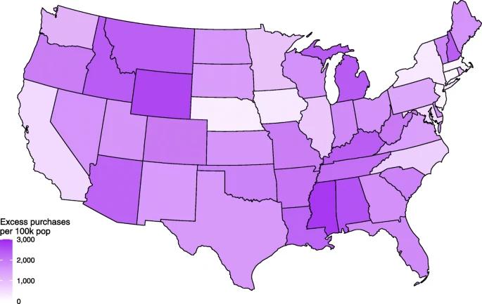 image: States with the most excess firearm purchases per 100,000 population are in darker purple.