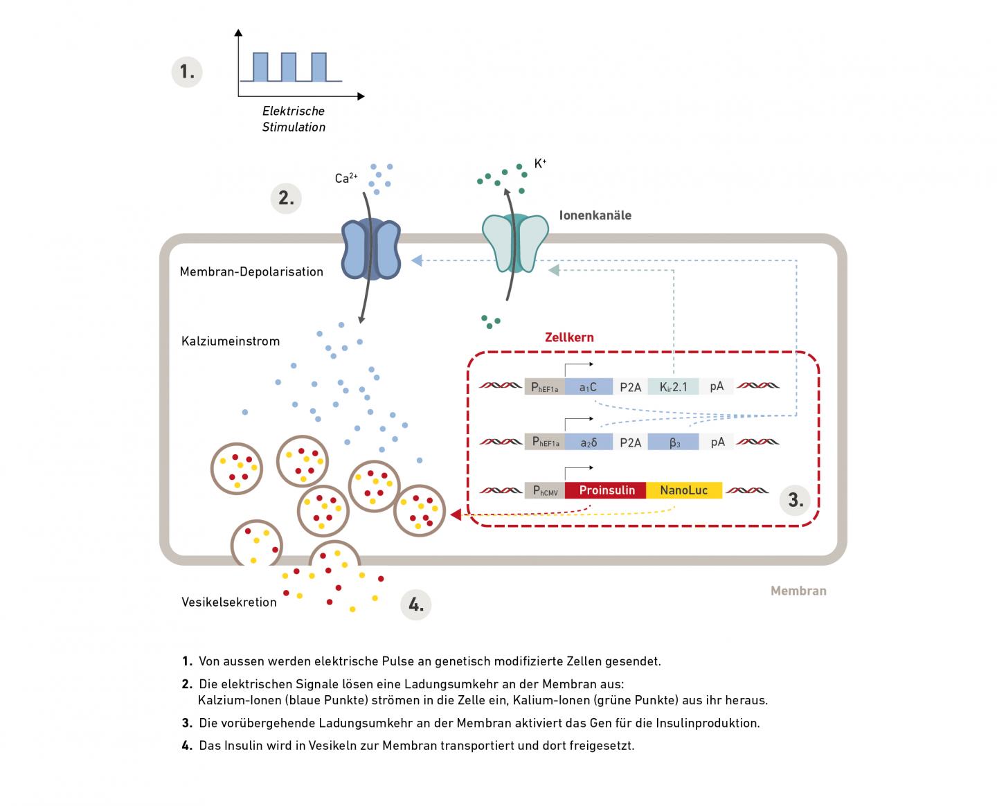 A radio signal from outside the body activates the electronics in the implant, which then transmits electrical signals directly to the cells. The electrical signals stimulate a special combination of calcium and potassium channels; in turn, this triggers a signalling cascade in the cell that controls the insulin gene. Subsequently, the cellular machinery loads the insulin into vesicles that the electrical signals cause to fuse with the cell membrane, releasing the insulin within a matter of minutes.