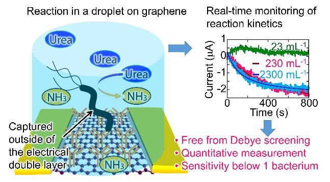 Osaka, Japan - Biosensors are currently used in healthcare to monitor blood glucose; however, they also have the potential to detect bacteria. Researchers at Osaka University have invented a new biosensor using graphene--a material consisting of a one-atom-thick layer of carbon--to detect bacteria such as those that attack the stomach lining and that have been linked to stomach cancer. When the bacteria interact with the biosensor, chemical reactions are triggered which are detected by the graphene. To enable detection of the chemical reaction products, the researchers used microfluidics to contain the bacteria in extremely tiny droplets close to the sensor surface.