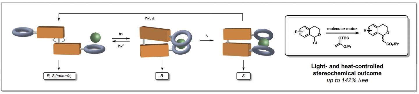 In this study, a very slow-turning motor molecule was used so that different stages of the rotation cycle could be used in catalysis. The molecular motor is made up of two identical halves, linked by a double carbon-carbon bond that acts as the axle. By sequentially exposing the molecule to UV-light and heat, unidirectional rotation around the axle is achieved. Consequently, the anion-binding groups on both halves of the motor are able to switch from being apart from each other (trans) to being in close proximity on the same side of the motor molecule (cis). In the cis configuration, the arms can adopt two different configurations leading to two different helices with opposite handedness. Dorel: 'The helicity dictates the enantiomer of the product that this catalyst will produce.'