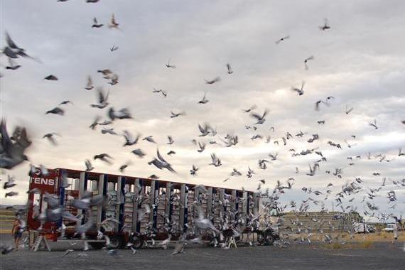 image: These are racing pigeons being released from Perpignan (France) to Belgium in 2011. In modern pigeon races, birds are transported to a common location in trucks similar to the one in the picture. After birds get released, they fly to their own lofts and are clocked by their owners. The average speed is used to rank the birds and it is a function of the time elapsed and distance to each individual loft. The winner of this race flew ~900 km at an average speed of 69 km/h.