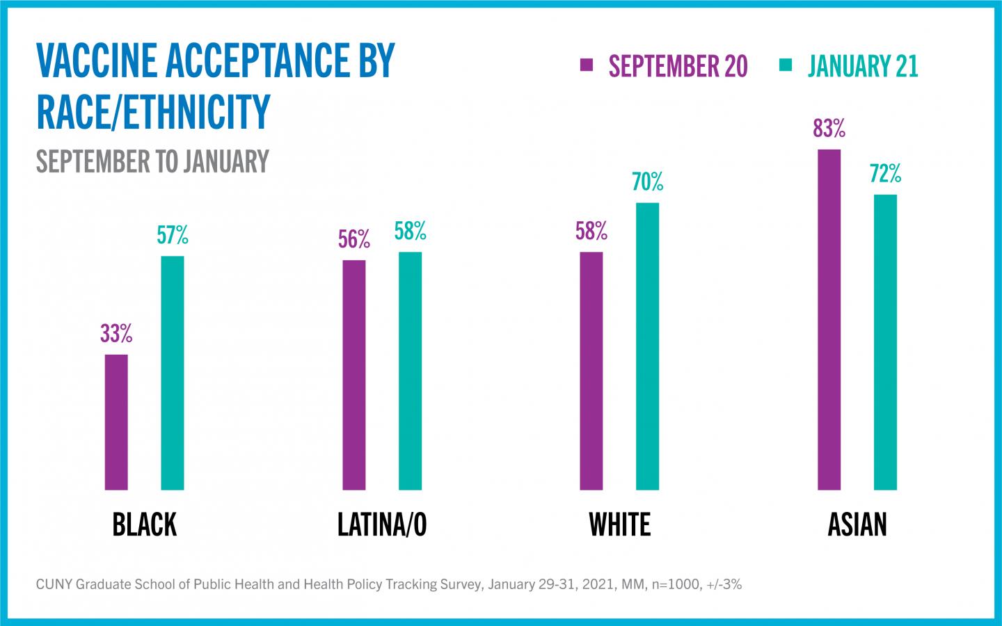 Differences in vaccine acceptance persist across racial and ethnic groups. Among Whites and Asians acceptance is 70-72%; among Blacks and Latina/os it is 57-58%. On a positive note, the largest increase in rate of acceptance was seen among Black respondents, up from 33% in September to 57% in January.