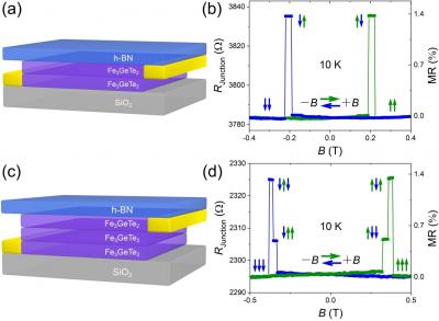 image: Two-state and three-state spin valves. Schematic illustration of (a) two-Fe3GeTe2-nanoflakes and (c) three-Fe3GeTe2-nanoflakes vdW homo-junction, with top h-BN passivation. (b), (d) The resistance of the junction (RJunction) as a function of the perpendicular magnetic field (B) at 10 K.