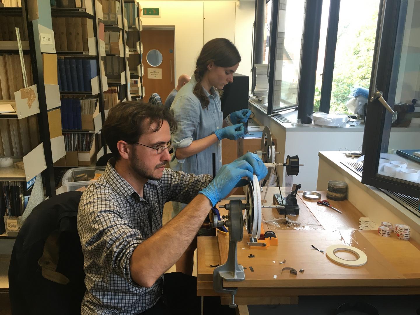 image: Professor Dustin Schroeder (foreground) and art historian Jessica Daniel splice 50-year-old film containing radar measurements of Antarctica into a reel in preparation for digital scanning at the Scott Polar Research Institute in the UK.