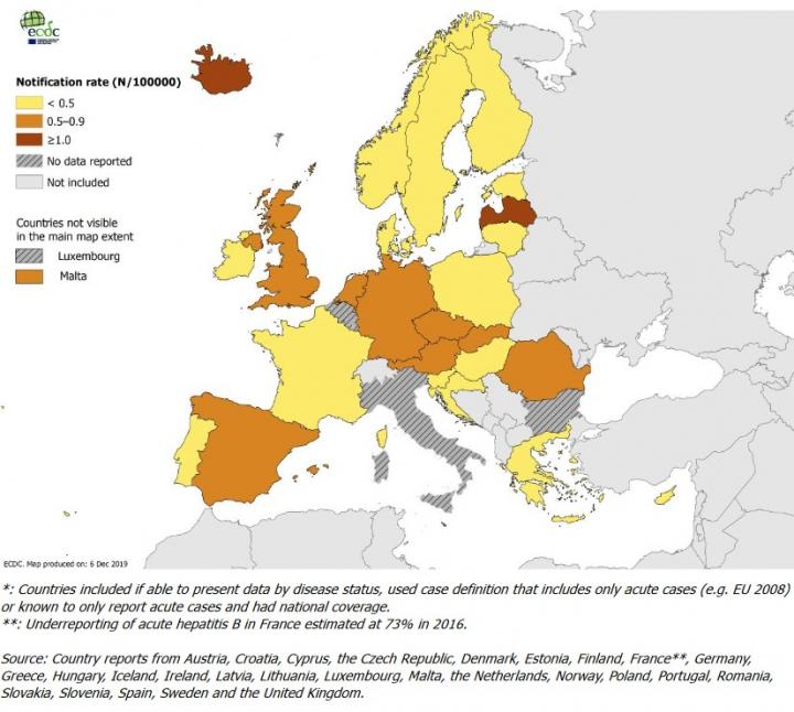 image: The number of newly diagnosed hepatitis B infections reported from countries across Europe remains high, with the majority of these infections classified as chronic. A marked variation between countries in the distribution of acute and chronic cases was observed. This geographical variation most likely reflects differences in local testing and reporting practices as well as underlying epidemiological differences.