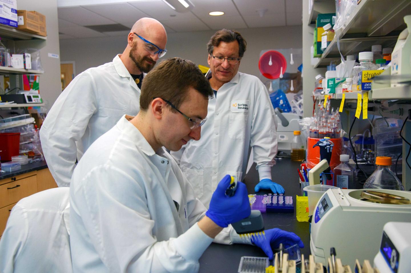 image: Mathew Gardner, PhD, and Christoph H. Fellinger, PhD, worked closely with mentor Michael Farzan, PhD, co-chairman of the Scripps Research Department of Immunology and Microbiology, on the study.