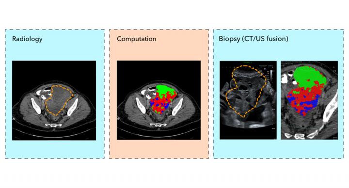 The researchers then used a process called radiomics - using high-powered computing methods to analyse and extract additional information from the data-rich images created by the CT scanner - to identify and map distinct areas and features of the tumour. The tumour map was then superimposed on the ultrasound image of the tumour and the combined image used to guide the biopsy procedure.