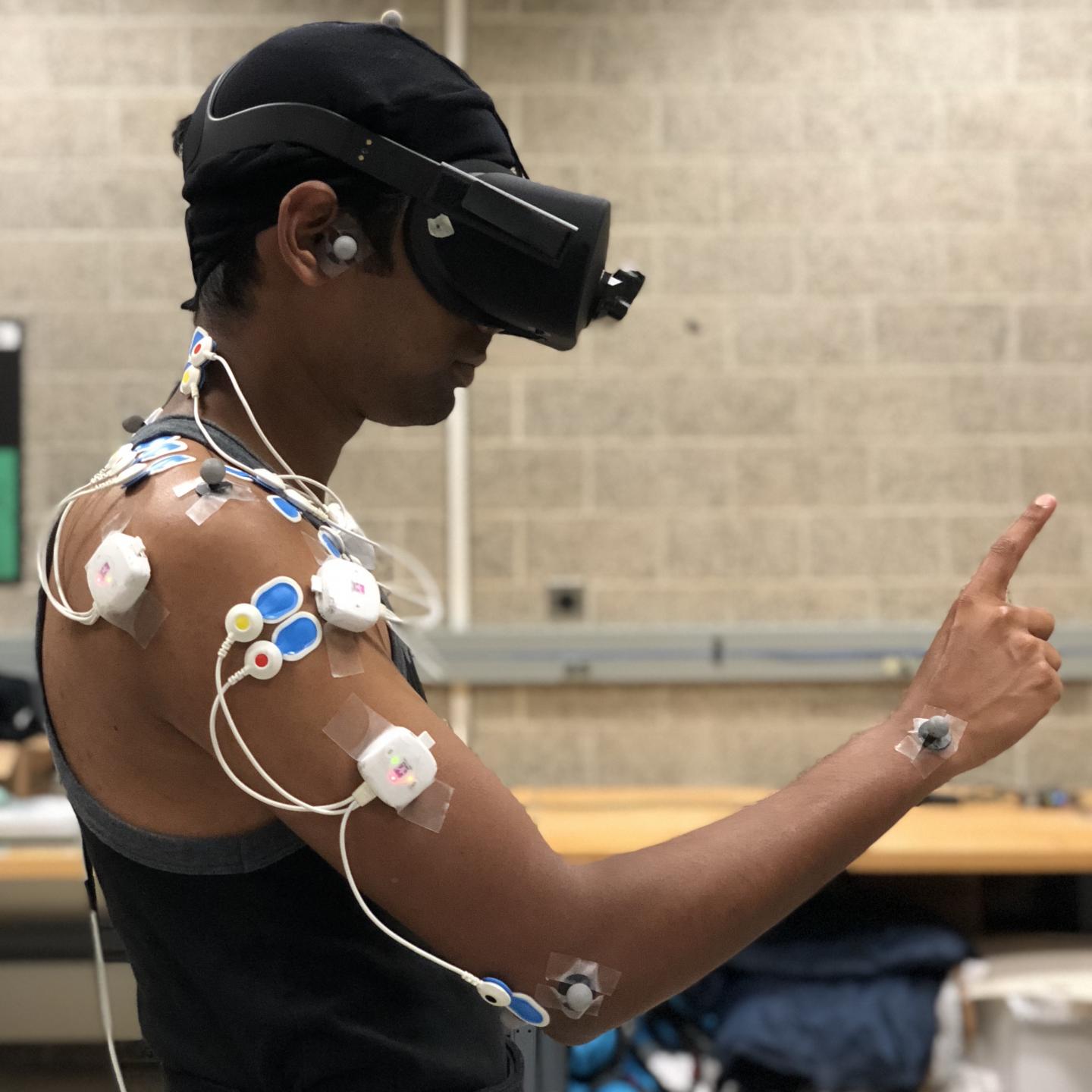 With sensors placed on participants' joints and muscles, researchers used motion capture to record their movements and electromyography to measure electrical activity in their muscles while performing common VR gestures. Wearing an Oculus Rift VR headset, participants were tasked with either pointing to specific dots around a circle, or coloring in a certain area with their finger.