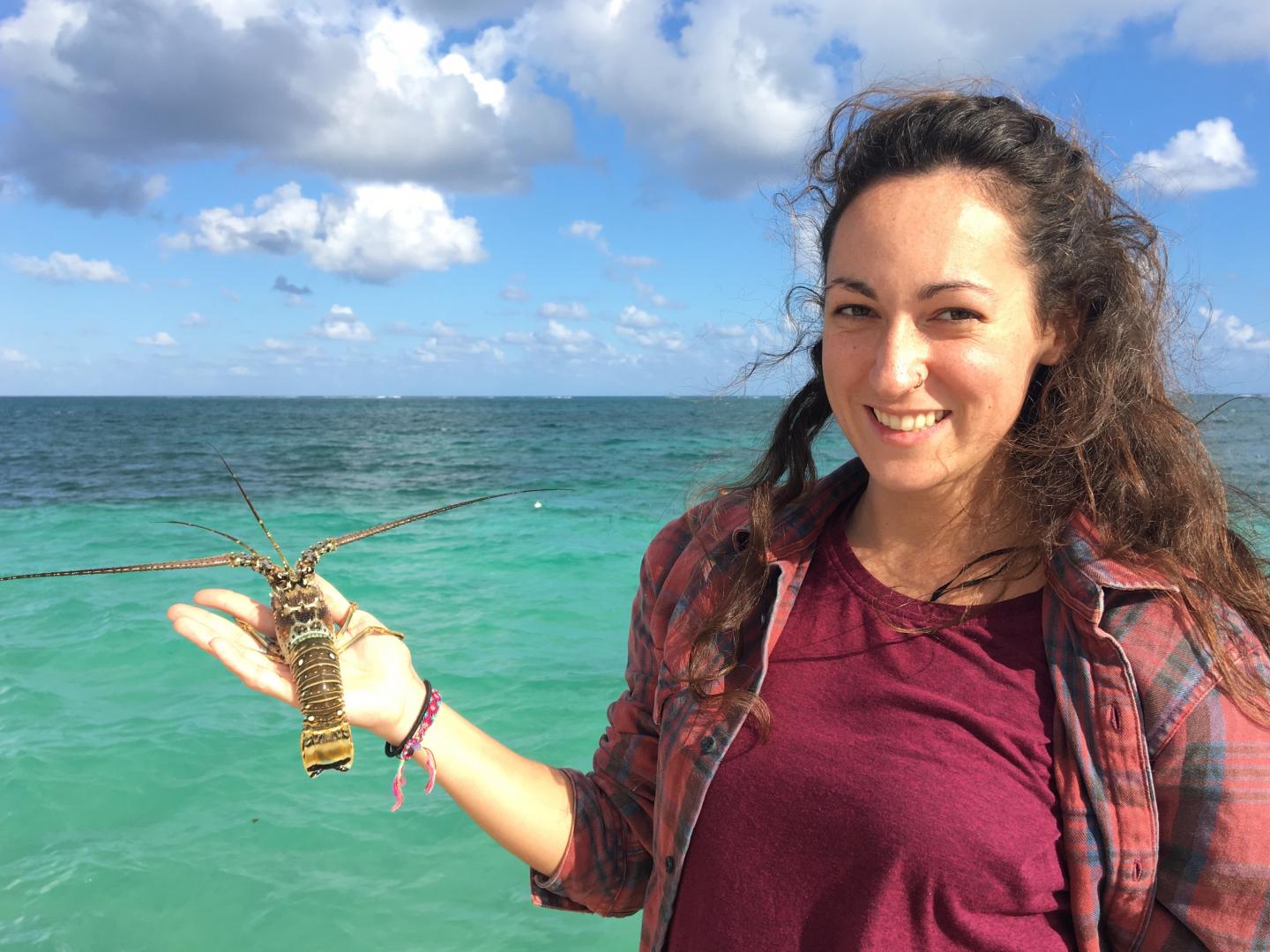 image: Dr Charlotte Eve Davies of Swansea University releasing a Panulirus argus lobster back to the wild after sampling: studies by her research team showed that there can be a link between virus prevalance and habitat for this species