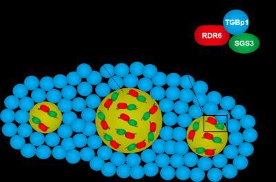 This is a model depicting that plant virus proteins (TGBp1: blue) aggregate and inactivate double-stranded RNA (dsRNA) synthesizing protein complexes (yellow: SGS3/RDR6 bodies).