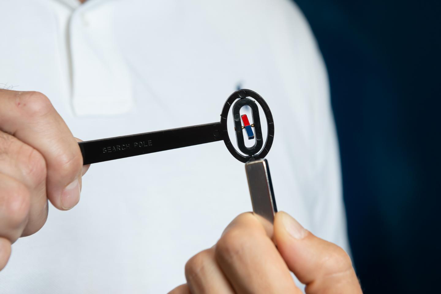 image: The device for determining the orientation of the magnetic field functions like a compass. If you hold it against a magnet (here, silver-grey), the blue-red pin rotates so that its red end points in the direction of the north pole.