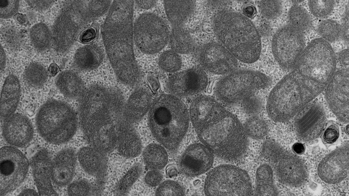 image: Electron micrograph of the muscle of a patient with mitochondrial disease.