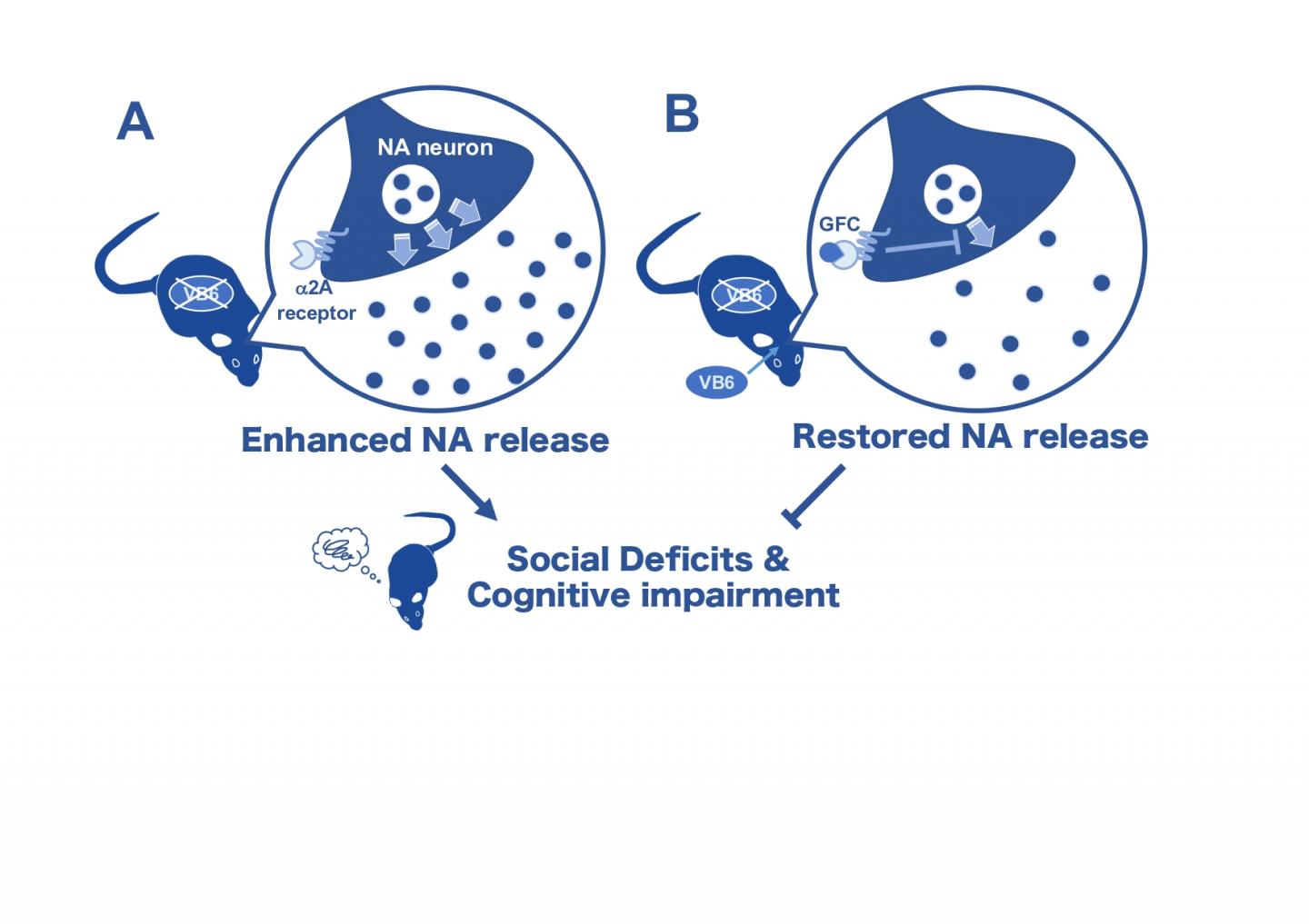 image: (A) VB6(-) mice showed hyperactivate noradrenergic (NAergic) signaling, resulting in behavioral deficits comparable to schizophrenia. (B) These are ameliorated by VB6 supplementation into the brain or treatment with the 2A adrenoreceptor agonist guanfacine (GFC), which suppresses NA release.