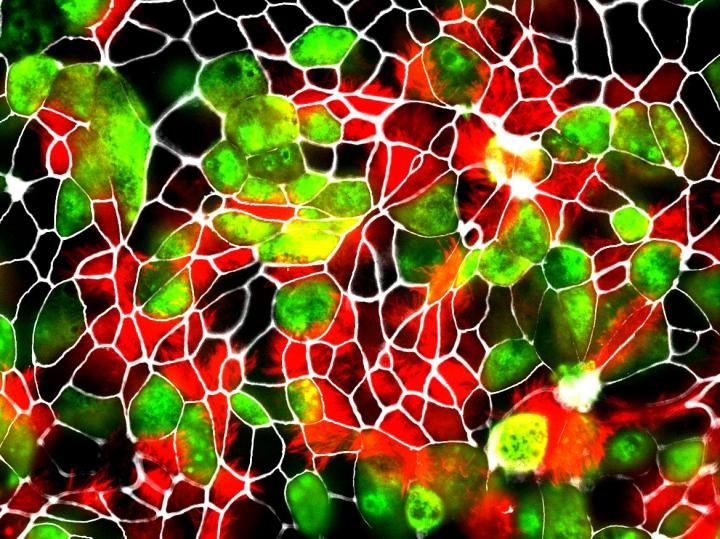 image: Close up of AEC cultures of Rhesus macaque showing the presence of SARS-CoV-2 infected cells (green).