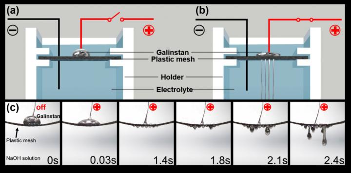 image: The penetration effect of galinstan through voltage control in an electrolyte. Schematic diagram of a galinstan droplet on a plastic mesh before (a) and after (b) the voltage is applied. (c) Snapshots of the penetration effect for a plastic mesh with 5 V applied voltage in 1 mol/L NaOH solution.