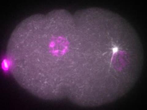 video: An embryo of a roundworm (C. elegans) is shown undergoing its first division. The embryo expresses fluorescent probes that mark the chromosomes in magenta and the microtubules--the filaments that separate the chromosomes--in gray.