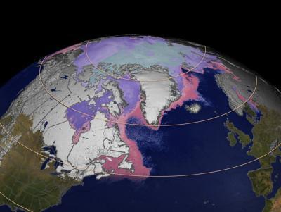 This image, taken by NASA's Terra satellite in March 2003, shows a much colder North America than Europe‑‑even at equal latitudes. White represents areas with more than 50 percent snow cover. NASA's Aqua satellite also measured water temperatures. Water between 0 and ‑15 degrees Celsius is in pink, while water between ‑15 and ‑28 degrees Celsius is in purple.