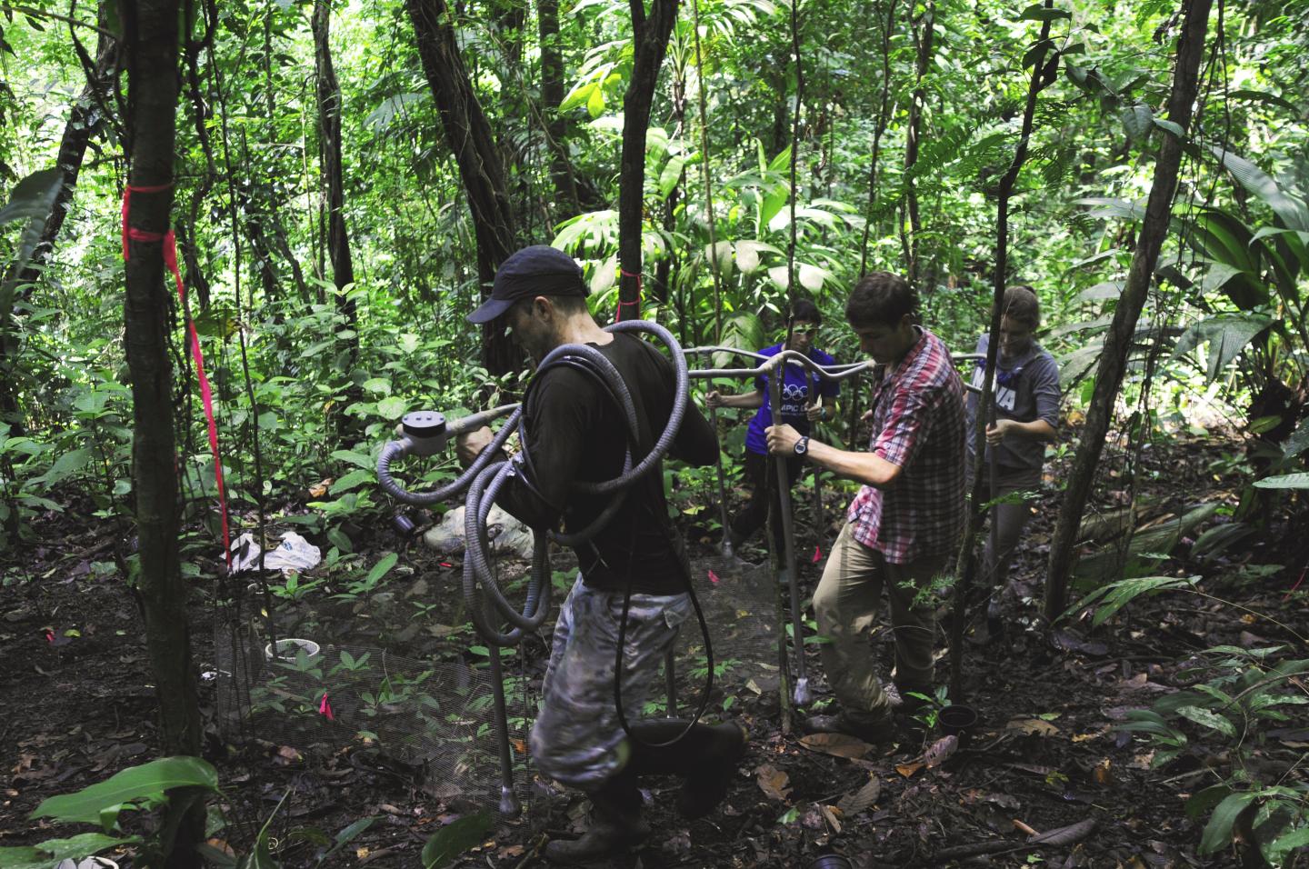 image: Researchers carrying experimental equipment on Barro Colorado Island, Panama.