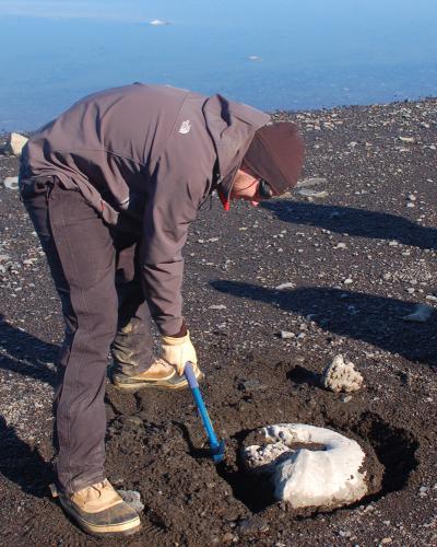 Thomas Tobin clears sand from around the fossil of a giant ammonite he found in 2009 on James Ross Island in Antarctica.