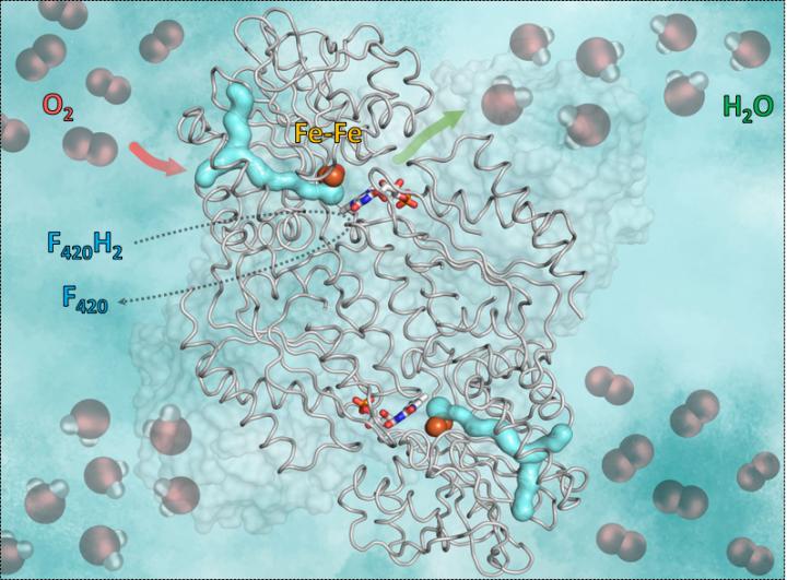 The mechanism, the researchers revealed, has an important requirement: Oxygen is very reactive, so it is crucial that the reaction is controlled correctly by the enzyme and no solvents are floating around. Otherwise the oxygen could accidentally be transformed in superoxide and kill the anaerobe. The trick of the enzyme F420-oxidase is to use a gas channel and a gating system. The oxygen molecule is first funneled in the specific channel to an appropriate anhydrous catalytic cavity containing iron. Then iron transforms the oxygen in water that will be released by a gating mechanism. For that the cavity begins to move and opens a small "door". Thanks to the movement, the newly generated water is transported outside. The empty cavity closes again and is available for the next oxygen molecule.