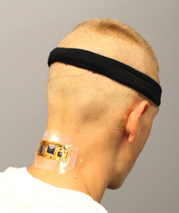 image: Test subject who has flexible wireless electronics conformed to the back of the neck, with dry hair electrodes under a fabric headband and a membrane electrode on the mastoid, connected with thin-film cables.