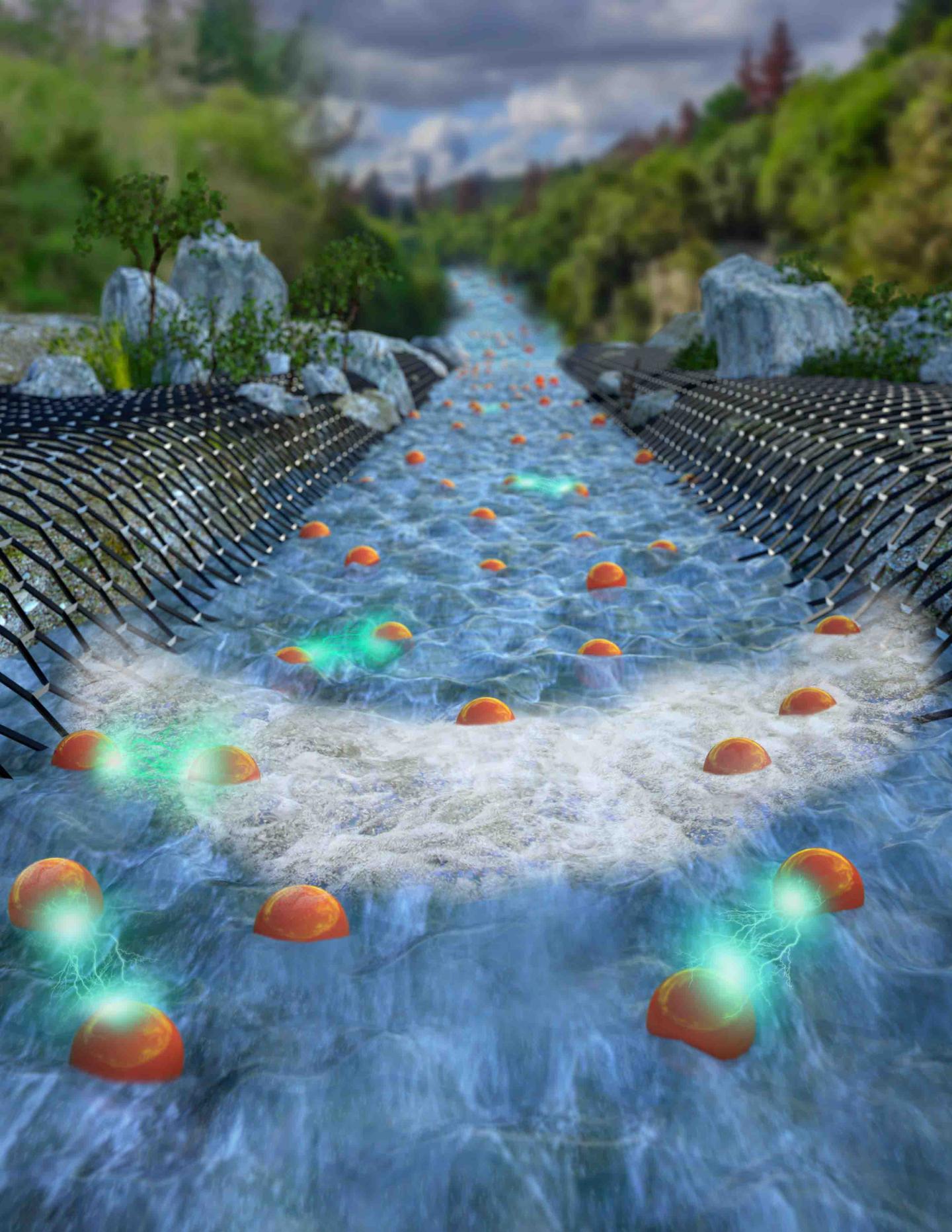 image: This is a 'river' of electrons flowing in a graphene channel. The viscosity generated by the repulsion between electrons (red balls) causes them to flow with a parabolic current density, illustrated here as a white foam wavefront