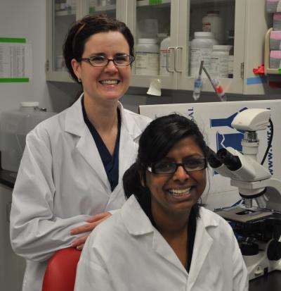 Western University graduate student Sumeeta Warraich (sitting) and supervisor, Cheryle Séguin identify the first-ever mouse model for DISH, the second most common form of arthritis.