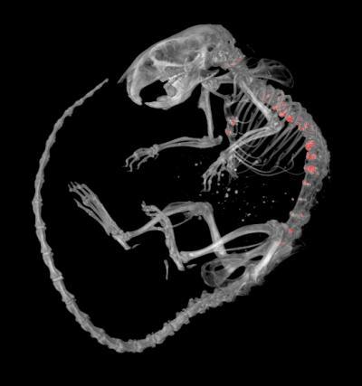This is a micro-CT image of mouse skeleton, showing excessively mineralized lesions (in red) along the spinal column and sternum (breastbone).