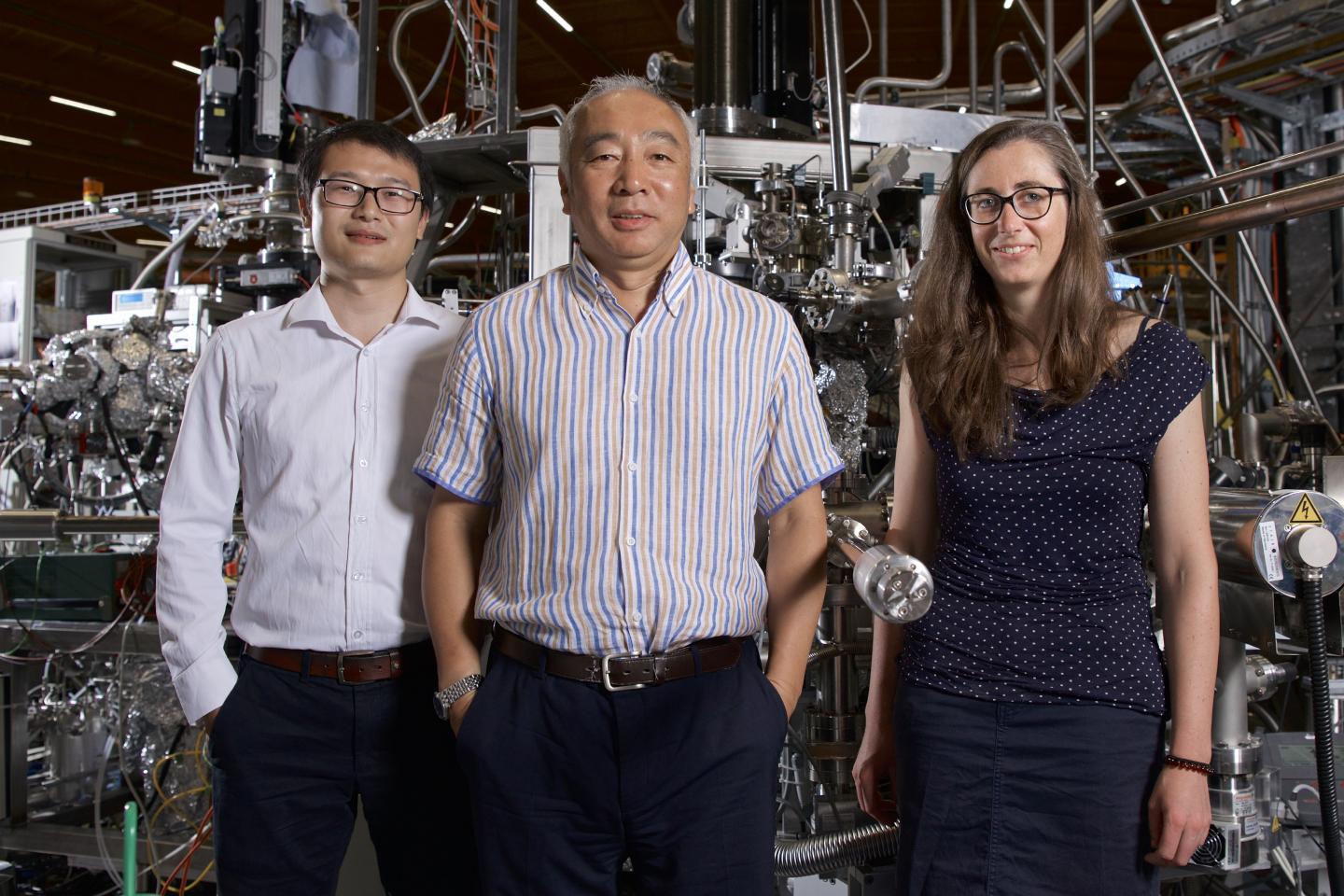 image: The 3 PSI researchers Junzhang Ma, Ming Shi and Jasmin Jandke (from left to right) at the Swiss Light Source SLS, where they succeeded in proving the existence of Weyl fermions in paramagnetic material.