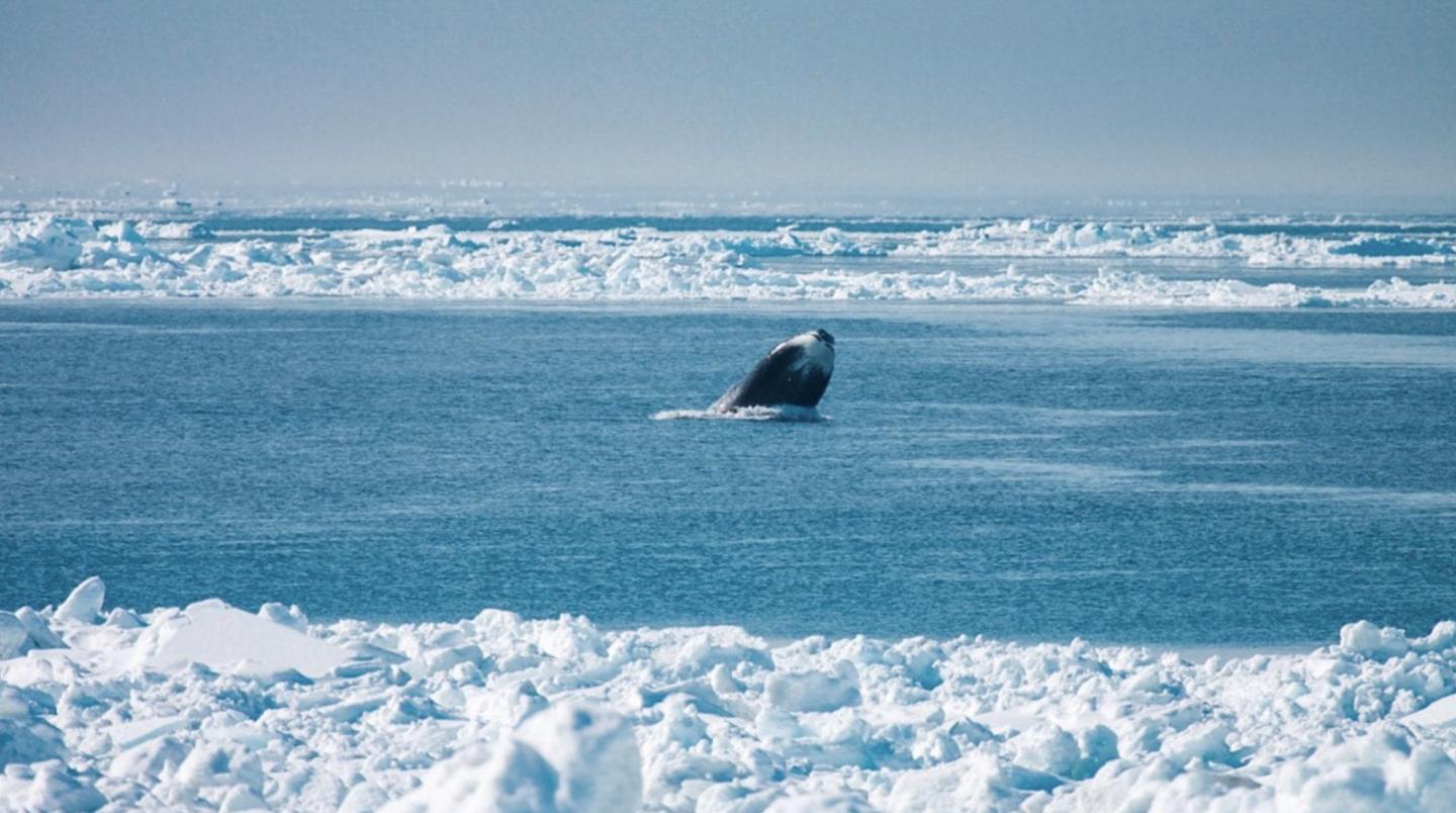 image: A bowhead whale breaches the surface of the cold waters near Point Barrow, Alaska.