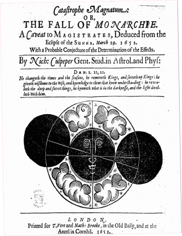 Nicholas Culpeper’s Catastrophe Magnatum, an astrological pamphlet written in 1652 about the so-called ‘Black Monday’ solar eclipse that year. Nicholas Culpeper / Catastrophe Magnatum (1652)
