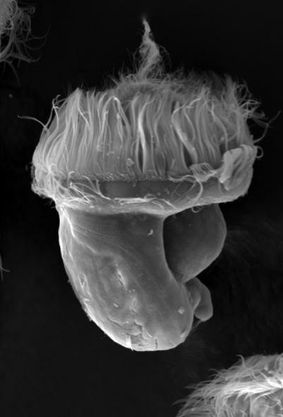 This shows a scanning electron microscope image of an 18-hour-old trochophore of the owl limpet. Trochophore are ciliated, free-swimming larvae that feed and drift in search of a good spot to set down roots before metamorphosing into their final and very different form.