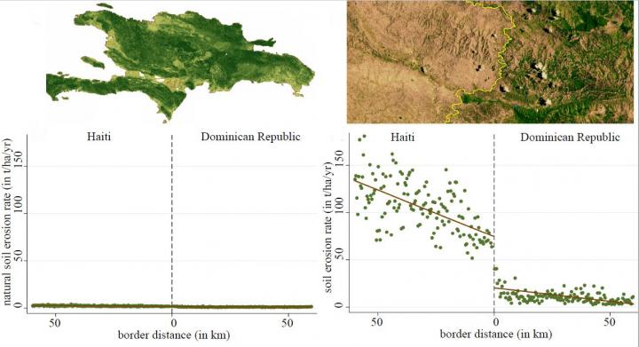 In reality, however, the researchers found that along the border, Haiti's soils lose 50 tonnes more per year and per hectare than those of the Dominican Republic. Wuepper explains that if Hispaniola had not been subject to human intervention and were still in its natural state, there would be no sharp increase in soil erosion along the border. "But the presence of such a rise points to political entities, not natural borders," he says.