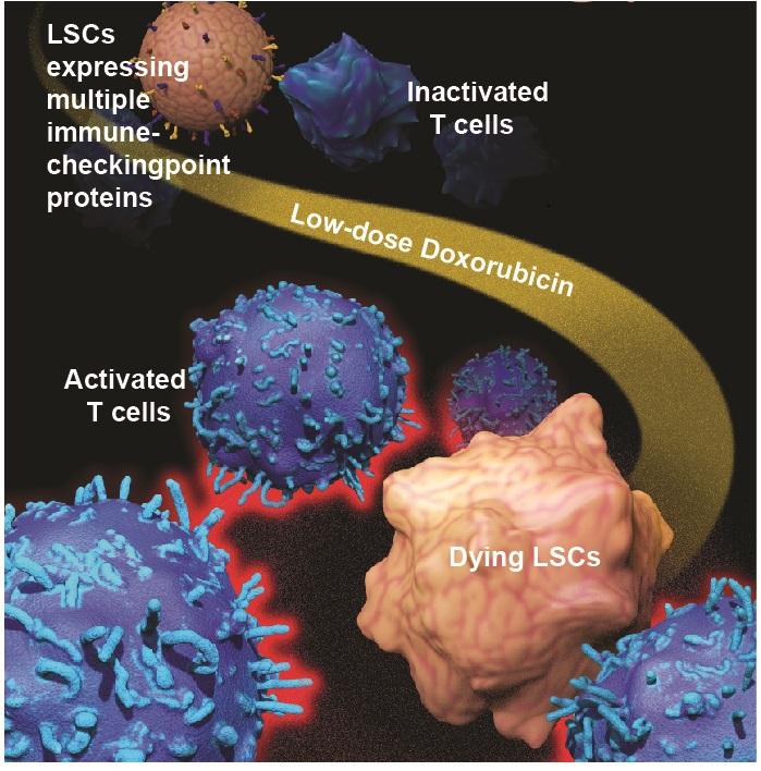 In addition to these encouraging results, the overarching study also revealed surprising insights into immune escape--a hallmark of cancer development in which cancerous cells evade the immune system and proliferate. Mechanistically, they found that leukemia stem cells express multiple proteins known as immune checkpoints, which turn off immune responses that might otherwise recognize and eliminate leukemia stem cells. Another team member, Fang Tao, PhD, uncovered that beta-catenin binds to multiple immune checkpoint gene loci. Low-dose doxorubicin treatment reduced expression of these immune checkpoints, including PD-L1, TIM3, and CD24, which exposed otherwise resistant leukemia stem cells to immune-mediated cell killing.