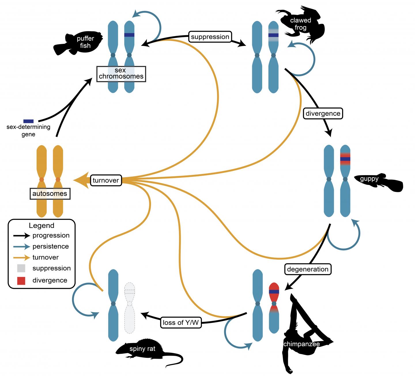 Most surprisingly, studies have revealed a far greater degree of sex chromosome diversity and turnover than previously appreciated. In fact, some lineages including lizards, fish, amphibians, insects, and plants show frequent changes in the location of sex determining genes and high rates of turnover of sex chromosomes. This led Mank and her co-authors to propose a new conceptual framework in which sex chromosome evolution is more cyclical than linear.