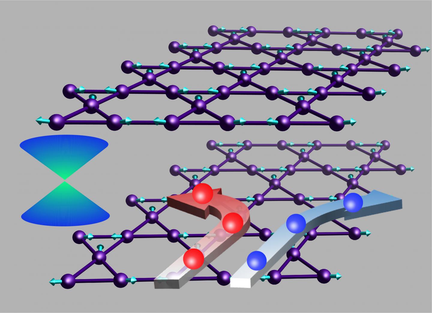 image: Schematic of the triangular vanadium net (purple balls) with magnetic moments (turqouise arrows) and the anomalous hall effect (red balls are electrons and blue are holes) from the Dirac quasiparticles (Dirac diabolo shown left).