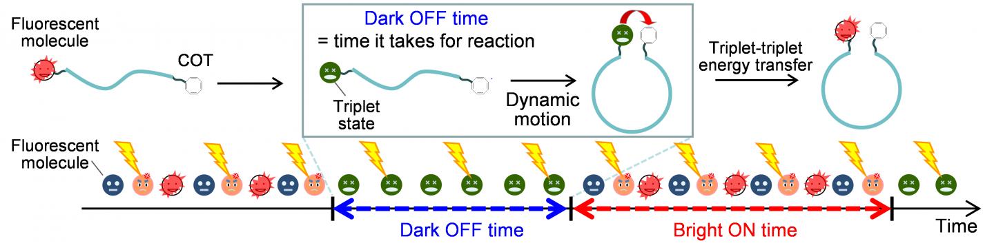 "COT suppresses fluorescence blinking, and so increases fluorescence, by coming into physical contact with the fluorophore," explains Jie Xu, lead author. "In contrast, modulating emission by a widely-used technique known as fluorescence resonance energy transfer, FRET, works over only much longer distances—in the region of 1 to 10 nanometers—and only on a nanosecond timescale."