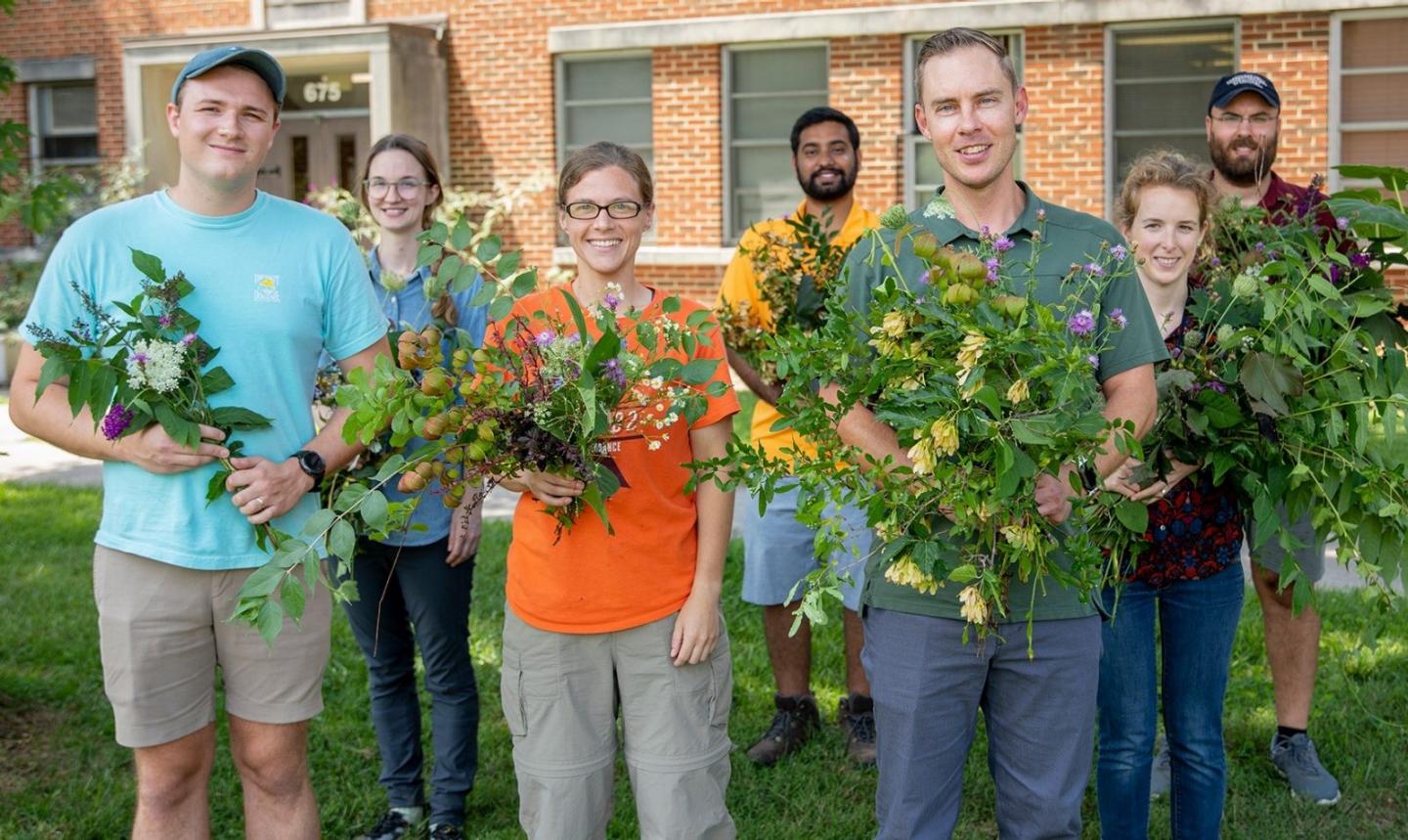 Gourav Sharma, Ariel Heminger, and Cody Dickinson hold an array of beautiful, though invasive, plant species, including Queen Anne's lace, spotted knapweed, butterfly bush, tree-of-heaven, Amur honeysuckle, Amur maple, and Japanese barberry. Collectively, invasive species - plants, animals, and diseases - cause an estimated $120 billion in damages each year.