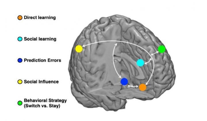 Within each group, the researchers scanned one of the volunteers' brain using functional magnetic resonance imaging, which allowed them to measure when and where the brain carries out both direct learning and social learning, and to characterize whether the two types of learning actually are associated with different neural signatures. The brain scans showed that direct learning is represented in the area called the ventromedial prefrontal cortex, whereas social learning is represented in the area called the anterior cingulate cortex. These two areas also interact with an area in the middle of the brain called the striatum, "which computes both reward prediction error and social prediction error, quantifying trial-and-error learning to inform behavior" says Gläscher. "These indicate an integrated brain network supporting social influence in human decision-making."