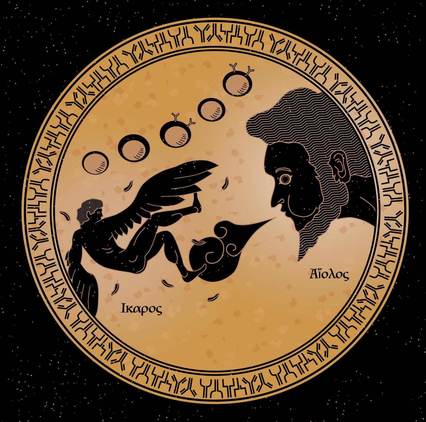 image: The transcription factors IKAROS and AIOLOS (named after Greek mythology characters) regulate lymphocyte development. According to Greek mythology, Ikaros had wings that were made of feathers and wax; one day, he flew too close to the sun and his wings melted which resulted in his fall and subsequent death. Aiolos, on the other hand, was a god of wind and, upon the command of the higher-ranking gods, he brought violent stormy winds to bring devastation and despair. In this artwork, the mutant Aiolos loses his control and power over stormy winds and going berserk. The artwork illustrates the fallen Ikaros not due to being very close to the sun, but instead as a result of being blown away by the mutant Aiolos.