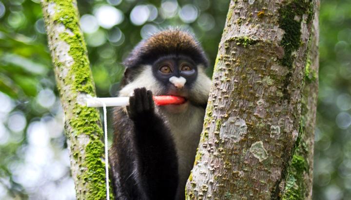 image: A red-tailed guenon in Bwindi Impenetrable Forest region in Uganda chews on a rope coated in jam, which is a noninvasive saliva sampling technique developed by UC Davis researchers. But flaviviruses are found in the blood and can be difficult to detect in wildlife.