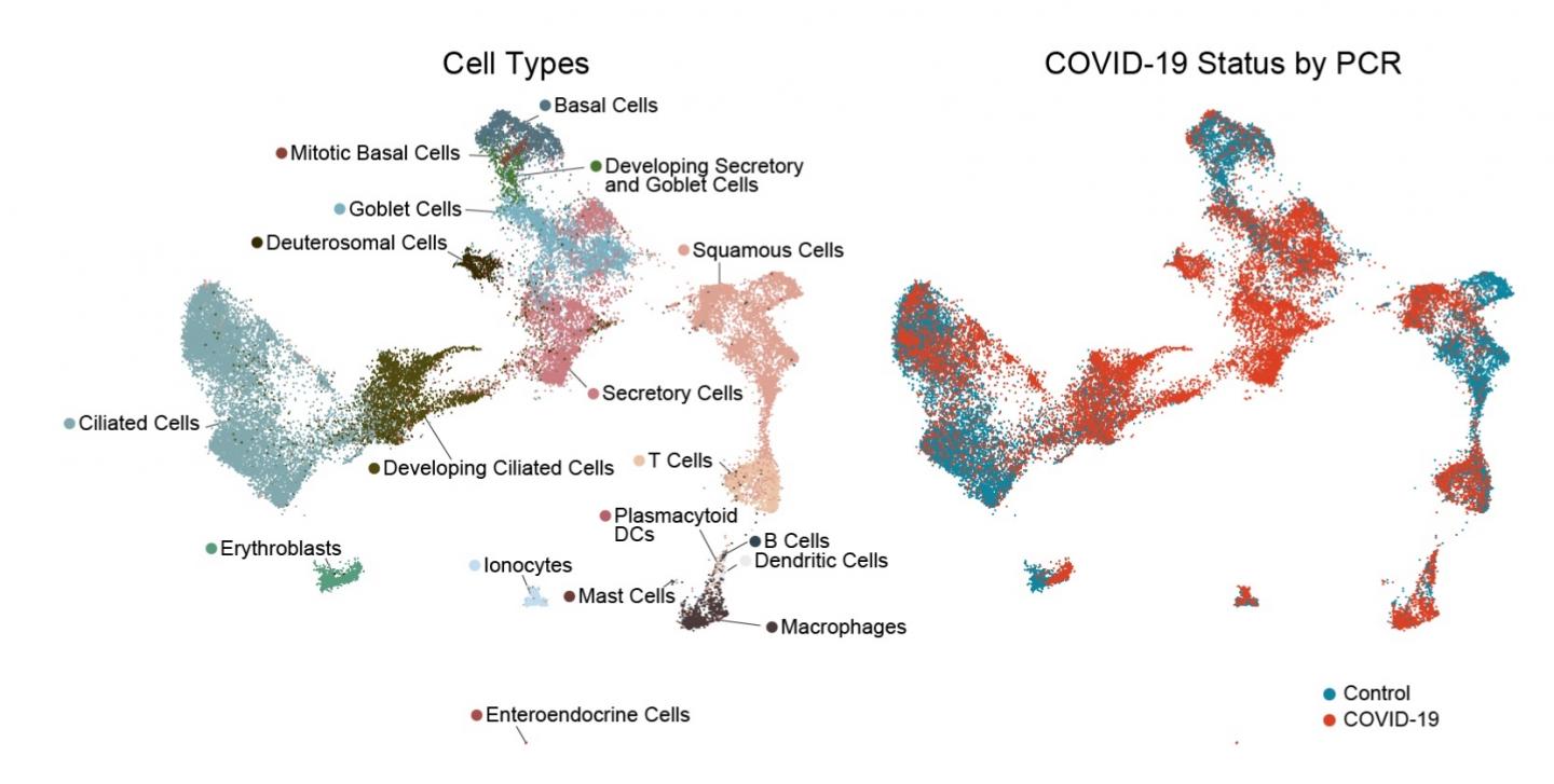 image: These maps represent gene expression in cells recovered from COVID-19 test swabs, based on single-cell RNA sequencing of more than 32,000 cells from 58 people. Each point in the maps represents an individual cell. At left, cell types from the nasopharynx are color-coded and arranged such that those with similar patterns of gene expression are in closer proximity. At right, red and blue colors indicate cell types that are enriched in COVID-19 (shown in red) and in healthy controls (blue).